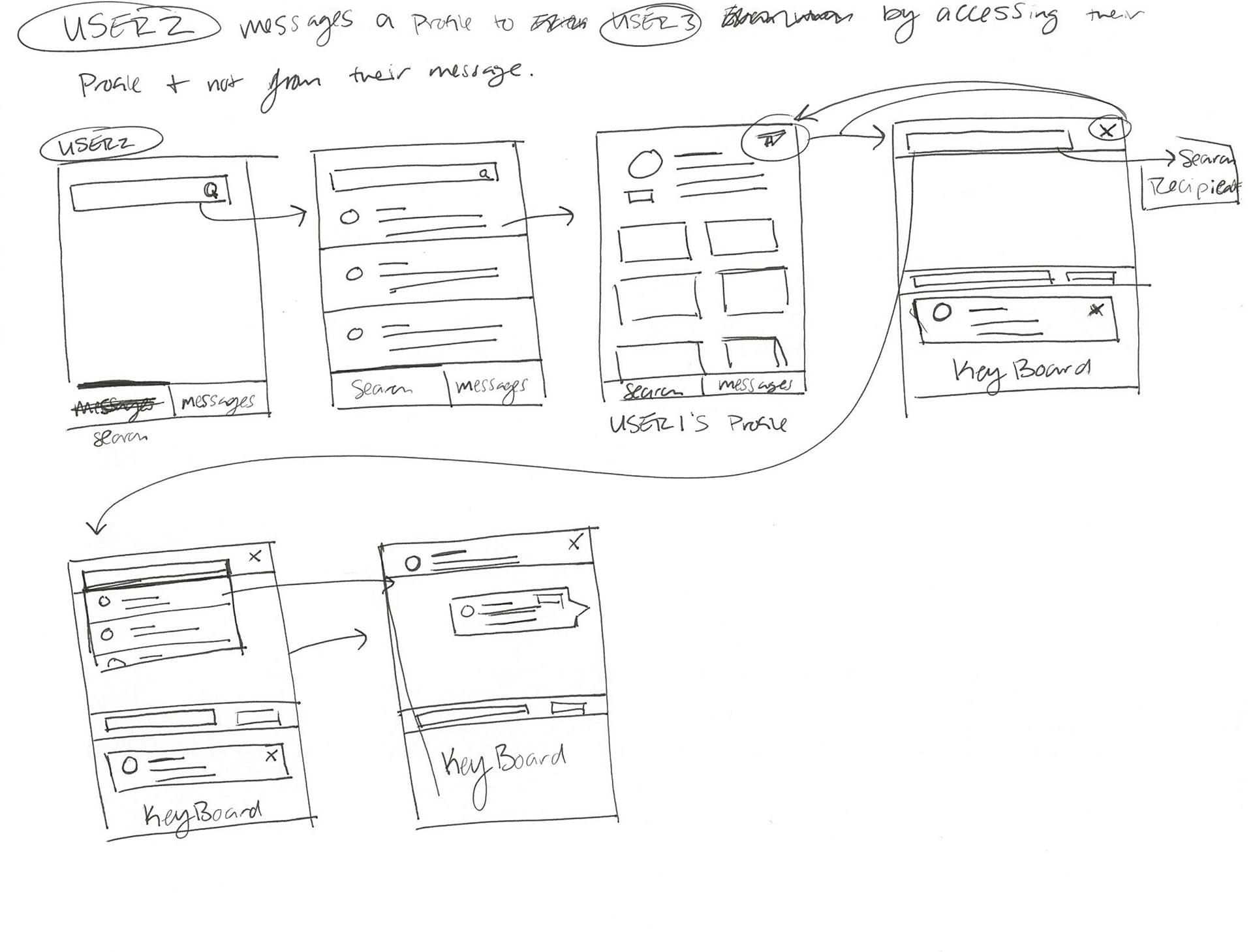 In the initial flow, the user would begin a message from the search results page. During the card sort, we discovered that users would like the option to view other users' profiles before sending a message. How users select viewing the profile or beginning a message will be tested once the visuals have been explored.