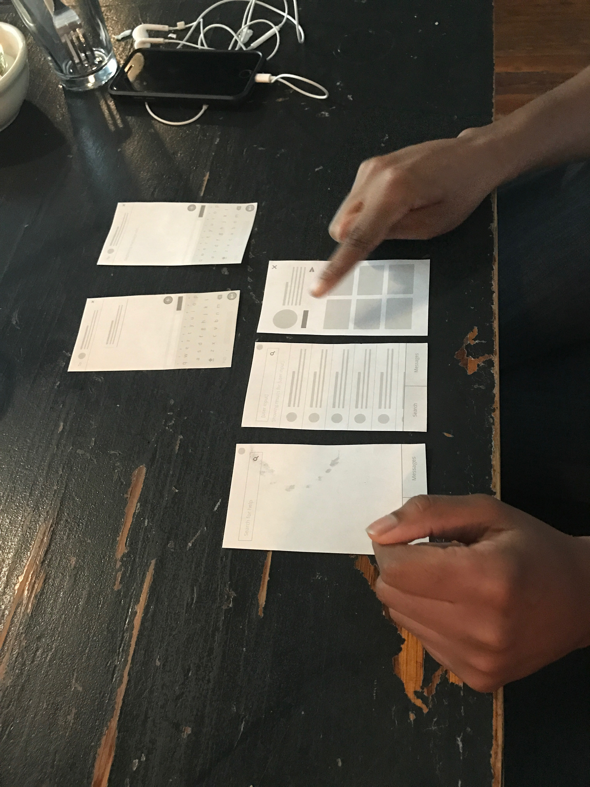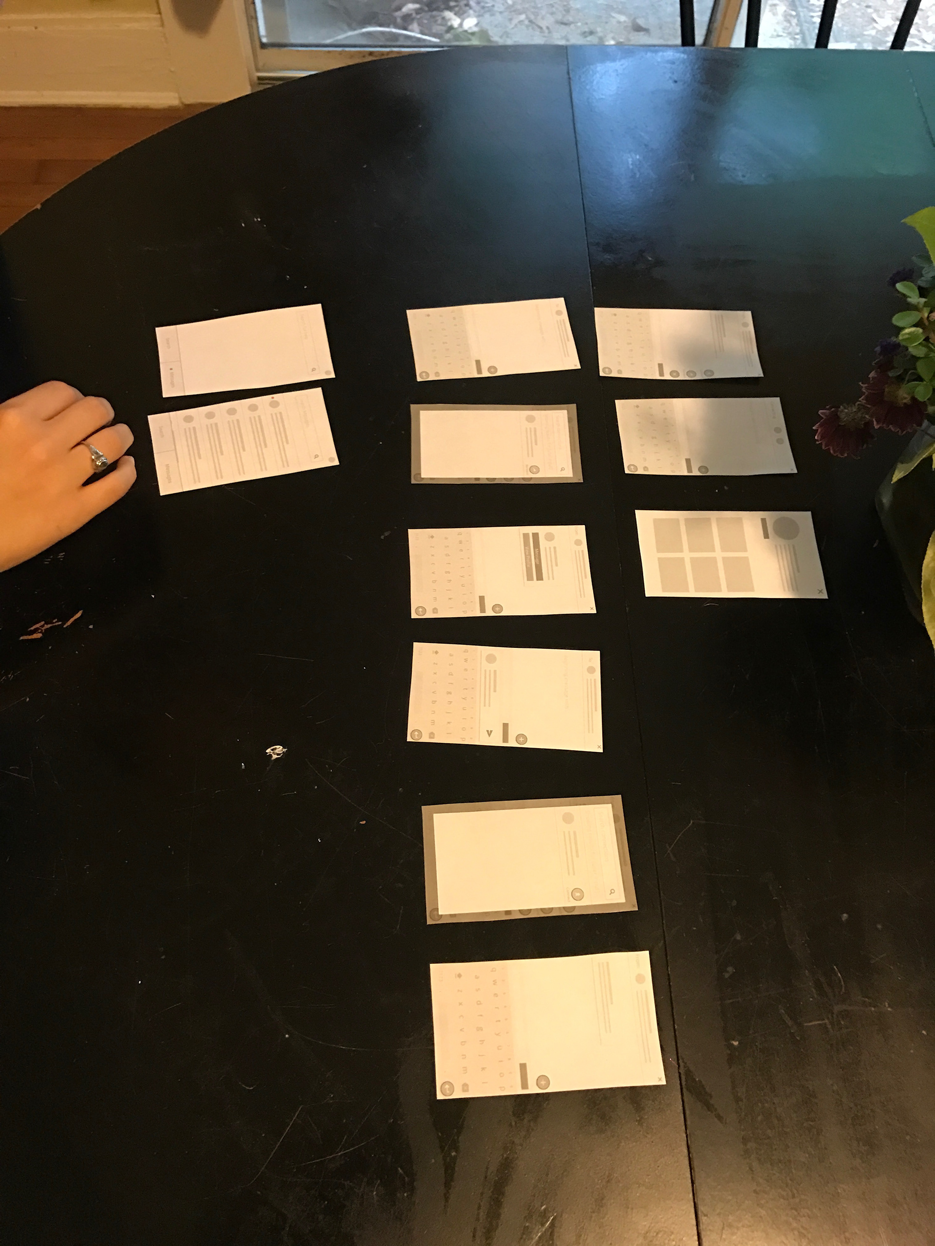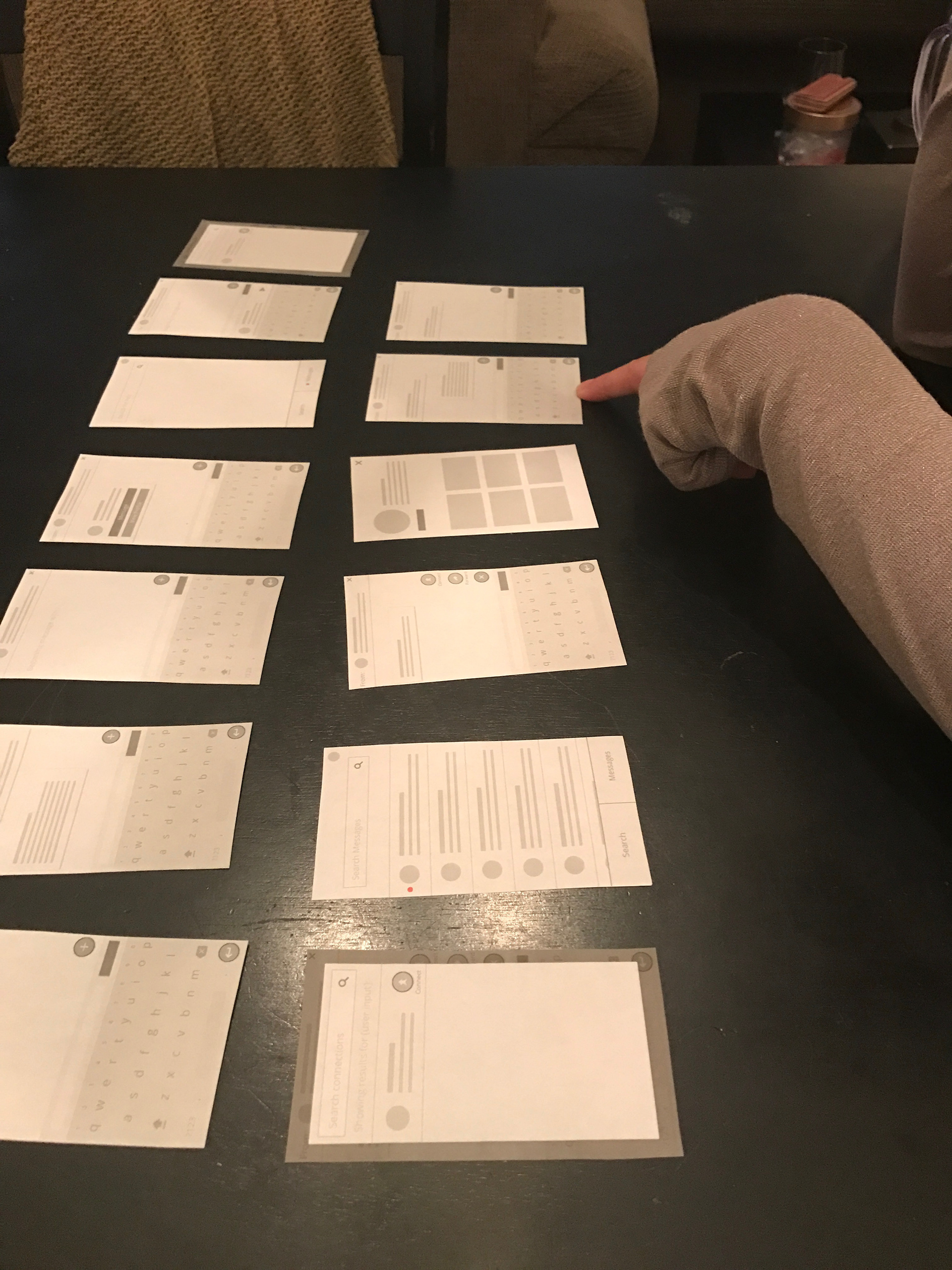 In this test, I placed paper cutouts of each screen on a table, read each of the previously defined scenarios, and had users select and place the screens s/he would use to complete each task.